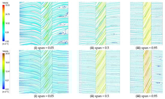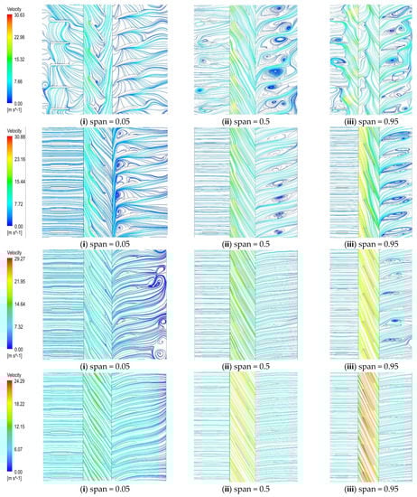 We expanded the annular cross-sections divided according to different leaf height values to obtain the velocity streamline distribution diagrams, which are shown in Figure 16 and Figure 17. Figure 16 is the velocity streamline distribution diagram under the pump condition, and Figure 13b is the velocity streamline distribution diagram under the turbine condition. From left to right are the velocity streamlines at the hub, the middle of the blade, and the rim, corresponding to span values of 0.05, 0.5, and 0.95, respectively. It can be seen from the figure that the velocity curves in the runner chamber are uniformly distributed on different annular sections, except for the small flow condition of forward running. Under the condition of small flow, it can be clearly seen that the streamline distribution on different annular sections was sparse and irregular, and there was a local backflow phenomenon at the inlet of the blade, indicating that the flow state was poor at this time. Under large flow conditions, from the inlet of the front guide vane to the outlet of the movable guide vane, the streamline distribution was uniform on the annular section, corresponding to different span values; there was also a local backflow phenomenon on the section of the blade. The backflow area mainly occurred at the outlet of the guide vane, which deviated from the runner chamber. The streamline distribution in the middle section of the blade was quite uniform, and the flow state was better while the operating flow was 0.8 times the design flow. When operating under working conditions, there was a backflow phenomenon between the movable guide vanes at different sections, the streamline became uneven, and the flow pattern deteriorated. When the operating flow was in the small flow range, the guide vane section and the runner section both experienced the backflow phenomenon, and the streamline distribution was irregular and uneven, indicating that the flow pattern had become poor. Therefore, avoiding the small flow range operation will protect the overcurrent components of the unit, and it is also a necessary condition for the pump to operate safely and stably. As the span value increased, the speed value increased. That is, the closer to the rim, the greater the speed, and the closer to the hub, the lower the speed.