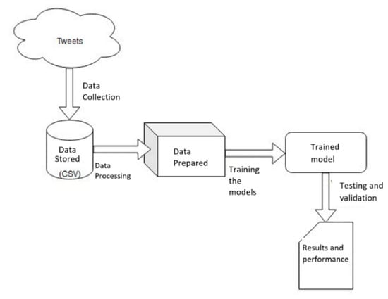 - Data preparation: aggregating a set of tweets in a CSV document—semi-structured format, using NLP techniques, such as tokenization, lemmatization, eliminating stop-words