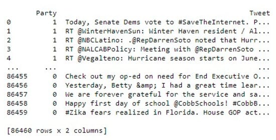 The data were collected through the Twitter API [14], which provides access to data and metadata. Additionally, a software tool called Hydrator [15] was used to automate the process of obtaining posts from the Twitter platform and store them in a semi-structured format. This tool is available in open-source format on Github. The result was a CSV file with 86,460 entries arranged in two columns: Tweet (post content) and Party (political party). These data were then extracted using the Python module, Pandas [16], and entered into a DataFrame object, as can be seen in Figure 2: