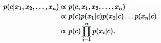 Given a vector of characteristics x = [x1, x2,…, xn], respectively the class of labels c ∈ {1, 2,…, C}, the probability of a given event of features to belong to a class is [24] (Figure 6):