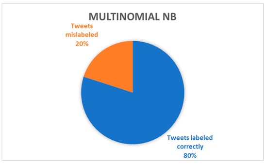 Figure 7 shows the accuracy percentage for the Multinomial classifier NB. Bases on the analysis performed, this model has the best prediction accuracy. Checking through multiple tests, the accuracy range of the classifier is between 76–82%, with values mainly in the upper area of the range. On average, we can consider that the accuracy of this classifier is approximately 80%. Compared to the current state of the art, the result obtained is acceptable, considering that related works based on neural networks reach an accuracy of 85–95%.