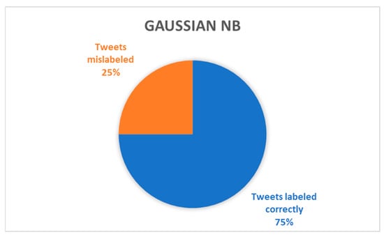 The accuracy range obtained for the Gaussian NB classifier is 73–76% (Figure 9), slightly lower than in the case of the NB Multinomial classifier. With an average of these accuracy values around 75%, the model based on the Gaussian NB algorithm correctly classifies at least three quarters of tweet posts. Although it does not reach the maximum performance of the Multinomial classifier, compared to the previously mentioned data in the current context, the results are satisfactory.
