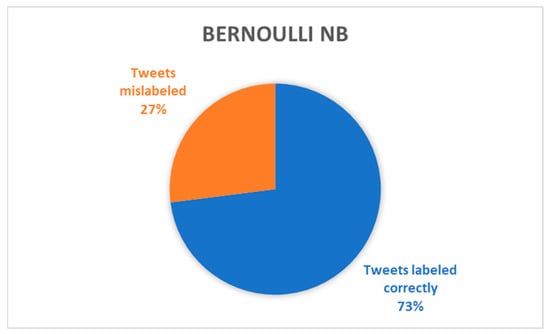 The Bernoulli classifier has the lowest accuracy of the three models (Figure 9 and has the largest number of incorrectly assigned labels. The accuracy range is 72–75%, with an average of about 73%. Thus, there are cases where this model correctly classifies just under three quarters of the total number of data. However, it should be noted that the Bernoulli algorithm is the fastest in generating results. The performance of this algorithm is lower because the algorithm is optimized for a smaller data set. However, considering all the values obtained so far for accuracy, the Bernoulli algorithm can also be used to result in acceptable values.
