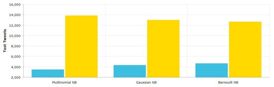 We further analyze the accuracy according to the number of correctly labeled posts. Figure 10 shows the Train-Test Split, using an 80–20 ratio. The number of correctly labeled posts decreases from Multinomial to Gaussian and Bernoulli (yellow column).