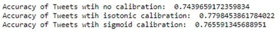 Calibration can improve prediction accuracy (Figure 11). For the data set used in our research, isotonic calibration provides the best accuracy, around 80%, which is similar to the Multinomial classifier. Based on the validation of the accuracy of the three algorithms, as well as of the calibrated variants, we concluded that the models can be used for the proposed purpose, namely, to identify the political orientation in tweets.