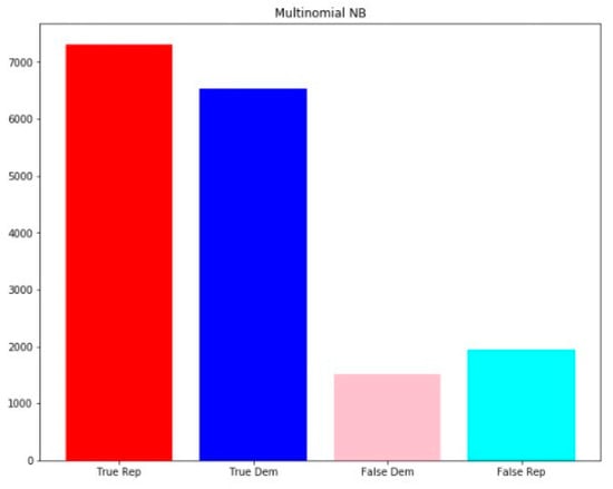 Thus, for precision, the values are very close and the hierarchy of algorithms is preserved. Moreover, the algorithms have a better classification accuracy for the Democrats. Figure 13 shows the values for True Republican and Democrat, False Republican, and Democrat for the Multinomial NB model.