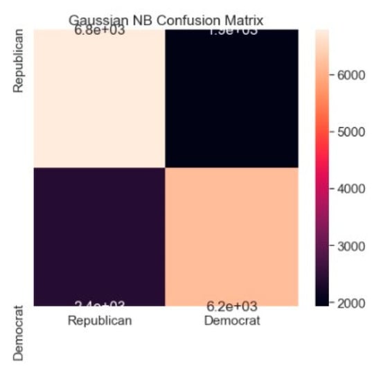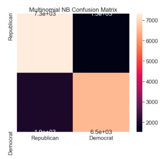 As can be seen in the Figure 15, on the main diagonal we have the tweets correctly labeled divided into categories: Republican and Democrat. It can also be seen that the values for the categories of tweets are in line with the distribution previously presented in Figure 10.