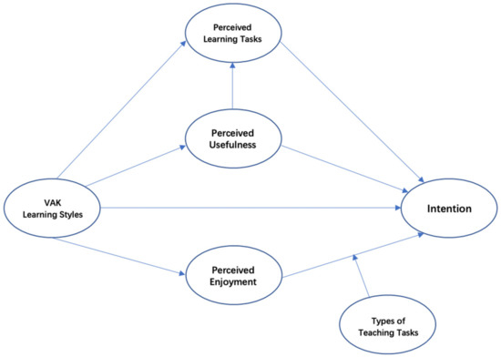 Learning style refers to the behavioral preferences of students in the process of acquiring knowledge. Pashler et al. [38] confirmed, through an experimental approach, that the same instructional strategies have different effects on learners with different learning styles. It is clear that most studies on game-based teaching did not take into account contextual factors, and that differences in students’ cultural backgrounds, learning goals, and learning styles may influence their willingness to participate in game-based classrooms [30,39]. In conjunction with the overall research, in this study, we will focus on the impact of differences in learning styles on behavioral intentions. Since classrooms with gamified activities are more interactive and practical, this study limits the variable “learning style” to “visual, auditory, and kinesthetic (VAK) learning style,” namely, it focuses on the relationship between the extent to which students have a VAK learning style and their intention to participate in online gamified classrooms. VAK learning styles refer to learners’ preference for visual, auditory, or kinesthetic acquisition of information when engaging in learning activities, their expertise in listening, and their experience with acquiring knowledge [40,41]. A common means of gamification in education is through the use of game-based websites, whose user interfaces usually consist of colorful and exaggerated visual images. Some websites also feature cheerful background music. From an objective point of view, these elements are a highly attractive new learning mode for students who are good at perceiving learning content through visual, auditory, and kinesthetic stimuli, and we hypothesize that students with VAK learning styles have a strong behavioral intention. On the other hand, in the TAM, learning style is an external antecedent variable which may have an impact on engagement intention through mediating variables such as usefulness, interest, and learning task arrangement. Therefore, four hypotheses are proposed:
