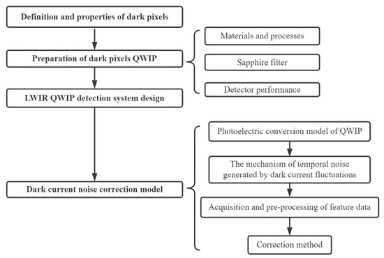 A schematic diagram of this section’s discussion is presented in Figure 1. First, we introduce the definition and characteristics of dark pixels. Next, we present the dark pixels’ QWIP preparation process and the information acquisition system’s design. Finally, we explain the dark current noise correction method in detail.