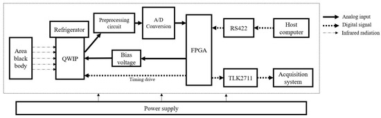 The main components of the LWIR QWIP detection system are shown in Figure 4. The blackbody model HFY300 for small surfaces was manufactured by the Shanghai Fuyuan Photoelectric Company (Shanghai, China). The blackbody’s surface diameter is 100 mm, its operational range is 20–70 °C and its temperature controlling accuracy is 0.01 °C. The LWIR QWIP detection system operates as follows. Radiation emitted from the blackbody is transmitted through the detector window to the image pixel; photons interact with electrons to produce the current signal, which is collected and processed by the readout circuit and output as an analog signal. Next, the information acquisition system proportionally amplifies and uses a low-pass filter for the analog signal output from the detector, performs an analog-to-digital conversion with 12 quantization bits, generates the digital signal, and transmits it to the Field Programmable Gate Array (FPGA). Finally, the FPGA transmits the processed digital signals to the data acquisition system via TLK2711 and stores them as image data. The quantized data stored in the system are called Grey value or Response value and their units are DN.