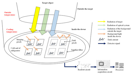 where is the total detector response voltage; is the response of the target object; is the response of the background outside the target; is the background light response inside the dewar; is the background response of the optical system; is the dark current response; and is the bias response of the readout and information acquisition circuits [34]. In the case of a constant detection target, acquisition environment, and operating mode, only changes in dark current response () can cause the total detector response () to change. The dark current response is expressed as: