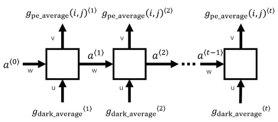 where U represents the weight matrix from the input layer to the hidden layer; W represents the weight matrix from the hidden layer to the hidden layer; represents the output vector of the hidden layer at moment t−1; and b represents the deviation matrix from the input layer to the hidden layer [39]. In this model, U represents the weight of the feature data of a certain group t of dark pixels arriving at the intermediate hidden layer. V represents the weight of the feature data of the central hidden layer arriving at a certain imaging pixel of the same group t. W represents the weight from the feature data hiding layer of the previous group to the feature data hiding layer of the next group t. As the ordinal number t of the group increases, the closer the W of the intergroup weights comes to the final result.