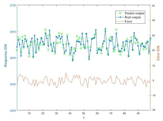 The RNN algorithm was used to train the feature data of dark pixels and imaging pixels to obtain the mapping relationship between them. The prediction model’s evaluation indices include the average absolute error, root mean square error, and average prediction accuracy. The correction effect of the imaging pixels (186, 53) was assessed. The conventional evaluation metrics of prediction models include the following three parameters: Mean Absolute Error (MAE), Root Mean Square Error (RMSE), and Mean Prediction Accuracy (MPA). MAE is the predicted value minus the true value, and the mean value after finding the absolute value. RMSE is the mean squared error squared. MPA is the mean true value minus the mean error, divided by the mean true value. After calculation, MAE was 1.93, RMSE was 2.28, and MPA was 99.93%. This is sufficient to demonstrate the RNN’s excellent performance in the prediction of this model. A comparison of the model’s predicted and actual experimental values is shown in Figure 10. Horizontal coordinates indicate the serial number of the experiment set; the left vertical coordinate, Response, indicates the dark level correction value, ; Predict output represents the predicted value; Real output represents the actual value; and the right vertical coordinate, Error, indicates the error value.