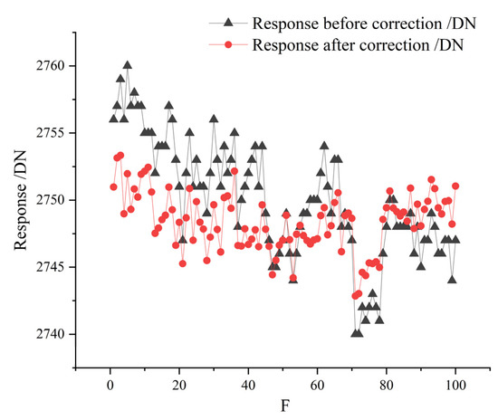 In the experiment, 100 frames of target data were acquired. After inputting into the model, was obtained and corrected using Equation (8). The responses before and after the correction of the imaging pixels (186, 53) are shown in Figure 11, which shows that the response’s fluctuation was reduced after correction. The horizontal axis indicates frame numbers F.