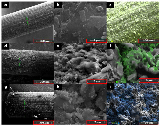 SEM images of (a) unmodified PGE at 300× and (b) 80,000×, EDX image of (c) PGE at 1300×. SEM images of (d) HAP-modified PGE at 300× and (e) at 20,000×. EDX image of (f) HAP-modified PGE at 12,000×. SEM images of (g) HAP- and copper-oxide-modified PGE at 300× and (h) at 400×. EDX image of (i) HAP- and copper-oxide-modified-PGE at 3000×.