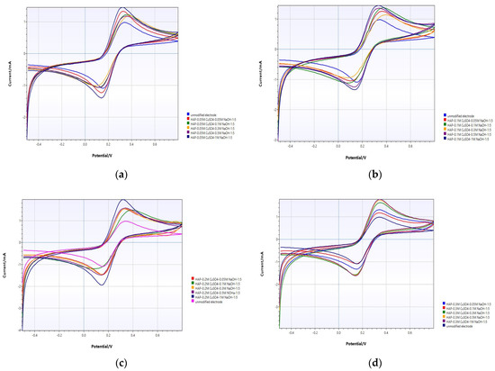 CV analysis of unmodified PGE and (a) HAP-PGE modified in 0.05 M and different concentrations of NaOH; (b) HAP-PGE modified in 0.1 M and different concentrations of NaOH; (c) HAP-PGE modified in 0.2 M and different concentrations of NaOH; (d) HAP-PGE modified in 0.3 M and different concentrations of NaOH; (e) HAP-PGE modified in 0.5 M and different concentrations of NaOH; (f) HAP-PGE modified in 0.7 M and different concentrations of NaOH; and (g) HAP-PGE modified in 1 M and different concentrations of NaOH.