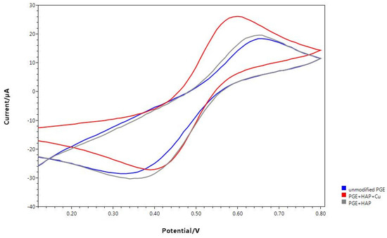 Electroactive surface area of unmodified and modified PGE was calculated in the inner-sphere redox probe Fe3+/Fe2+ in 1.0 M HCl by cyclic voltammetry. The voltammogram in Figure 4 was recorded in 2.0 mM FeCl3 in 1.0 M HCl with a scan rate of 10 mV s−1. The increase in the electroactive surface area after modification with HAP and CuO was determined according to the Randles–Sevcik Equation (1).