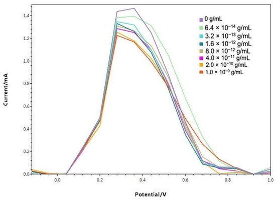 In Figure 6, square wave voltammetry results of modified electrodes incubated for 10 min at various concentrations of NP in 0.1 M PBS are given. Accordingly, as the NP concentration increases, the SWV response for the redox probe decreases. The reduction in the analytical signal by the particular interaction between antibody modification on the electrode surface and NP is assumed to be the cause of this outcome [34,48]. The binding of the nucleocapsid protein to antibodies on the biosensor surface causes the closure of the electroactive parts on the modified electrode surface and blocking of the SWV signal. As a result, reduction in measured current is considered as a great result, showing SARS-CoV-2’s presence.