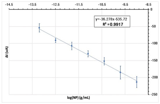 The calibration graph of SWV signal suppression obtained at each NP concentration versus the logarithmic function of the NP concentrations is given in Figure 7 (n = 3). According to this graph, the measurements show linearity with a high correlation coefficient (R2 = 0.9917) between 6.4 × 10−14 g/mL and 1 × 10−9 g/mL NP concentration range.