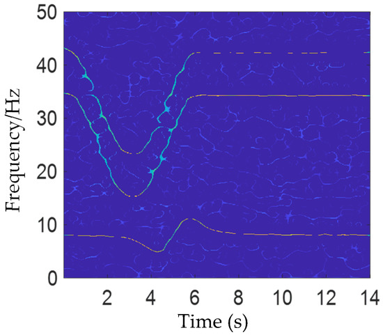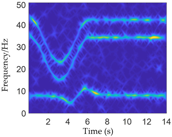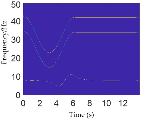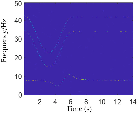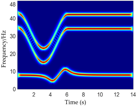 The sampling frequency is 100 Hz, the sampling time is 14 s, and the window width length is selected as 100. The time-domain waveform of the simulated signal is shown in Figure 1. To verify the effectiveness of the RSECT, here, it is compared with the SET and GLCT [22]. Figure 2, Figure 3 and Figure 4 show the time–frequency distribution obtained from the GLCT, SET, and RSECT methods, respectively.
