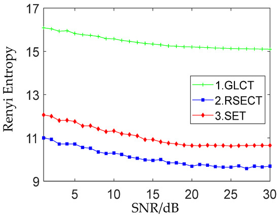 The more concentrated energy of the TF results indicates a stronger localization ability and better time–frequency characteristics. Rényi entropy is an important index to evaluate TF aggregation. A lower value of Rényi entropy indicates more concentrated energy. Therefore, to further verify the superiority of the proposed method numerically, white noise with SNR from 1 dB to 30 dB is added to the simulation signal, respectively. The Renyi entropy of TF representation generated by the three different methods is shown in Figure 9. It can be found that the noise increases the Rényi entropy, indicating that the noise can derive the energy aggregation of the above methods. In addition, the GLCT is susceptible to noise interference. The RSECT has the lowest Rényi entropy value, indicating that the method has the best TF aggregation and noise immunity. The Rényi entropy value of the SET is between the two methods.
