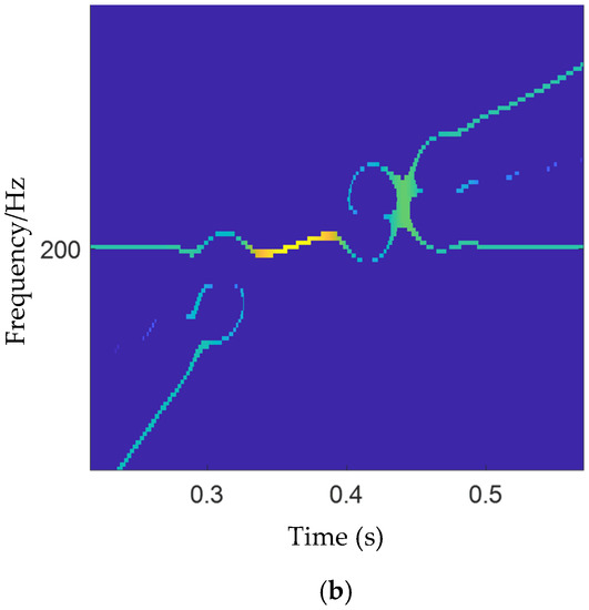 Synchroextracting transform (SET) is a novel time–frequency (TF) analysis technique, which was proposed by Yu et al. [1] under the inspiration of the synchrosqueezed transforms (SST) method [2]. SET constructs a synchroextracting operator (SEO) based on STFT to extract the TF coefficients at the TF ridge, thus removing the redundant signals around the TF ridge and greatly improving the accuracy of TF analysis. Due to the good TF aggregation performance and noise robustness performance, SET has been widely applied in petroleum exploration [3], fault diagnosis [4,5], power equipment testing [6], and bearing performance evaluation [7] once it was proposed. Yu [8] was the first to apply SET to the TF analysis of the vibroacoustic signals of excavators, and he obtained the conclusion that SET has better TF aggregation and better noise robust performance by comparing it with SST and STFT. Li et al. [9] verified that SET can greatly improve TF aggregation and can perfectly describe the local TF characteristics of FM signals through theoretical numerical simulation analysis and comparison with SST.
