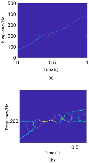 The simulated signal is processed by the RSECT, SET, and GLCT, respectively. Figure 11, Figure 12 and Figure 13 show the TF distributions obtained from the GLCT, SET, and RSECT, respectively. Comparing Figure 11, Figure 12 and Figure 13, the frequency characteristics of the constant-frequency signal and FM signals can be basically extracted regardless of the GLCT, the SET, or the RSECT. However, the three methods have obvious differences in the TF resolution of the signal. The GLCT is obviously inferior to the SET and RSECT. Comparing Figure 12 and Figure 13, the SET is significantly inferior to the RSECT when dealing with the instantaneous frequencies of cross-components. The RSECT combines the respective advantages of the GLCT and SET, which not only maintain the high-precision TF resolution but also have certain robustness to the processing of cross frequencies. From the local zoomed-in diagram of the TF distribution, it can be seen that the GLCT has a certain anti-aliasing property, but its TF accuracy is not high enough at the cross of frequency components. The SET meets a certain time–frequency accuracy, but the anti-aliasing property is not enough. Only the RSECT satisfies both the anti-frequency aliasing performance and high TF accuracy. Therefore, the RSECT gets better results than the GLCT and SET in processing cross-frequency signals.