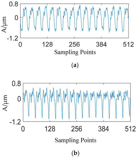 The vibration signals in the horizontal and vertical directions are measured by setting the speed at 3000 r/min, 1024 sampling points and 1600 Hz sampling frequency. Figure 21 shows the time-domain diagrams of two sets of horizontal vibration signals. Figure 22 shows the frequency spectrograms corresponding to Figure 21. From the frequency spectrograms, the signals contain various frequency multiplier components, which are the typical spectral characteristics of rubbing faults. It can be roughly judged that the first group of signals corresponds to slight rubbing, while the second group is severe rubbing.