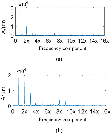 Spectrum diagram of rubbing fault. (a) Slight rubbing (b) Serious rubbing.