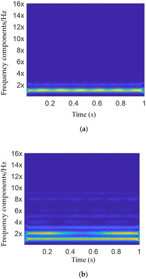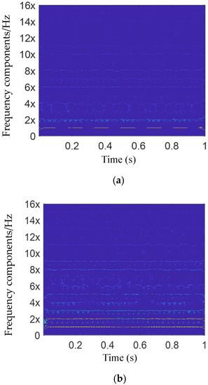 From the time–frequency results of the slight-rubbing-fault signal, the GLCT results only represent 1× and 2× component that are present throughout the signal, and the magnitude of the 2× component is less obvious. However, the other higher-order components are not clearly characterized. The SET and RSECT not only characterize the 1× and 2× components, but also the other high-order components such as 4×, 6×, 8×, and 10× components. In the characterization results of high-order components, the RSECT obtains higher amplitudes of the components, which is more advantageous than the SET. From the time–frequency results of the serious rubbing fault signal, the 1× component of the signal persists and has a relatively stable amplitude. The 2×, 3×, and 8× components also persist, but their magnitude varies slightly. The higher-order frequency components such as 5×, 8×, 9×, and 11× components appear intermittently in a more regular manner with small changes in amplitude. From the time–frequency results, the fault characteristics of rotor rubbing can be observed by the fact that only some low-order frequency components persist when slight rubbing occurs. The high-order frequency components with weaker amplitude are excited at intervals. When severe rubbing occurs, in addition to the low-order frequency components, more frequency components will persist, and the amplitudes of some of the frequency components will change slightly according to a certain rule, while the higher frequency components are still intermittently affected. When severe rubbing occurs, in addition to the low-order frequency components, more components persist and the amplitudes of some of these components change slightly according to a certain rule. While the higher-order frequency components are also excited at intervals.