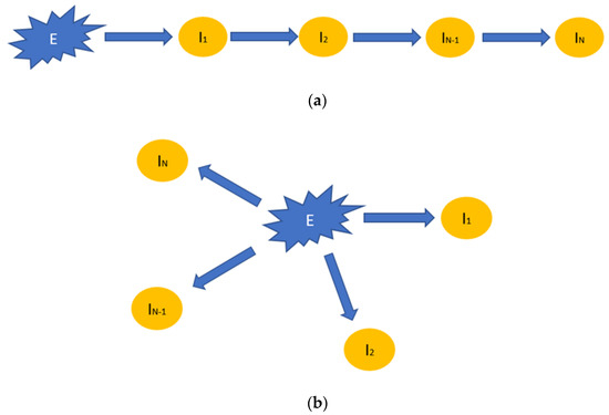 (a) Failure typology 1: Cascading effect (E: Earthquake, Ii: Infrastructures). (b) Failure typology 2: Common cause (E: Earthquake, Ii: Infrastructures).