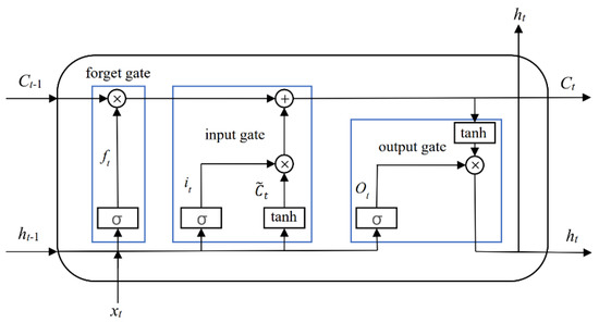 LSTM was first proposed by Hochreiter and Schmidhuber [24] and its structure is shown in Figure 1. LSTM is a special form of recurrent neural network (RNN). Unlike the traditional RNN, LSTM adds memory cell blocks to each neuron of the hidden layer, and these determine the degree of memory for forgetting of information through input gates, forget gates, and output gates. LSTM has a long-term memory function and can be effectively used with respect to regression problems for time series. The main formulas are as follows: