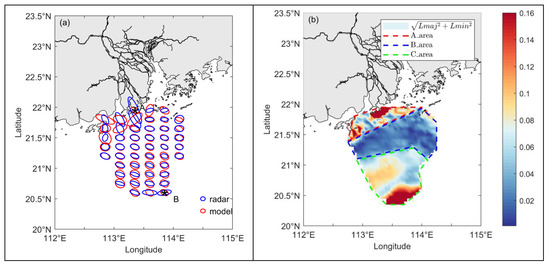 (a) EOF ellipses calculated from the HF radar (blue) currents and model (red) currents within the radar observing area. The data points are plotted at 0.25° × 0.15° intervals. Point A (113.35°E, 21.95°N) and point B (113.85°E, 20.6°N) are marked with “*”. (b) Errors between the radar and model ellipse were calculated using , where Lmaj and Lmin denote the major and minor axes of the ellipses.