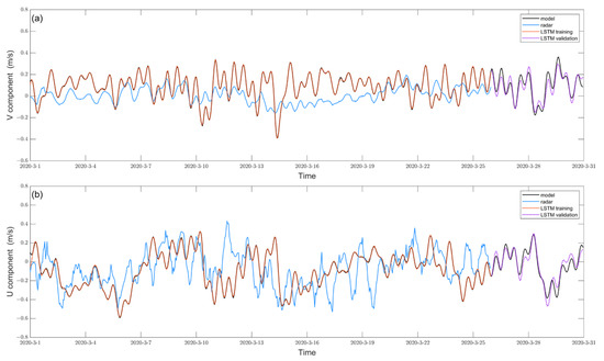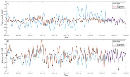Figure 4 is the same comparisons as in Figure 3, but for point B in area C. It is noteworthy that the u-component shows almost opposite phase difference between the radar and model currents during the training period (Figure 4b). This is the reason why the EOF ellipses of the radar and model show opposite orientations at point B (Figure 2a). In our previous research [23], we found that the Shangchuan station showed large errors in area C, whereas the Wanshan station did not. Compared with the model, the radar velocities at Shangchuan station were systematically underestimated by half. Moreover, the currents were mainly determined by tides and winds in this region, which can be adequately captured by Doppler spectra, therefore, the HF radar should have been able to resolve the currents. Therefore, the errors in the area C might originate from the radar systematical bias of the Shangchuan station. After correction by the LSTM, the validation sets of LSTM velocities show a PCC of 0.94 and RMSE of 0.05 m/s compared to the model values.