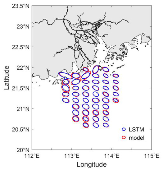 Since the LSTM enabled successful error correction at sites A and B, we applied this algorithm to the whole radar observing area. Figure 5 shows the comparison of the EOF ellipses between the model velocities and the LSTM results. Compared to Figure 2a, all ellipses in the three areas have been corrected to some extent. Table 1 shows the area-averaged PCCs and RMSEs for the three areas. Overall, the LSTM-corrected velocities show significant improvement in the three areas, compared with the original radar velocities. The LSTM-corrected velocities obtain the smallest RMSE and highest PCC in area C, and the highest RMSE and smallest PCC in area A. This implies that, with physical information with respect to winds and tides, the LSTM works effectively in area C, where the current variability is mostly modulated by tides and winds. In contrast, the current variability in area A is much more complicated. In addition to the winds and tides, the Pearl River runoff and the local topography and coastlines are also important influencers of the currents in area A.