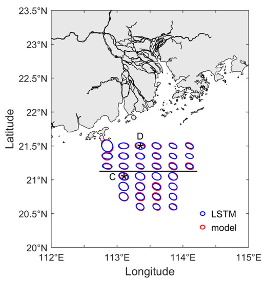EOF ellipses calculated from LSTM validation results (blue) and model (red) in area B and area C (marked in Figure 2b), which are separated by a solid black line. The whole area C was corrected by the LSTM network trained by point C and area B was corrected by the LSTM network trained by point D. Point C (113.1°E, 21.05°N) and point D (113.35°E, 21.5°N) are marked with “*”.