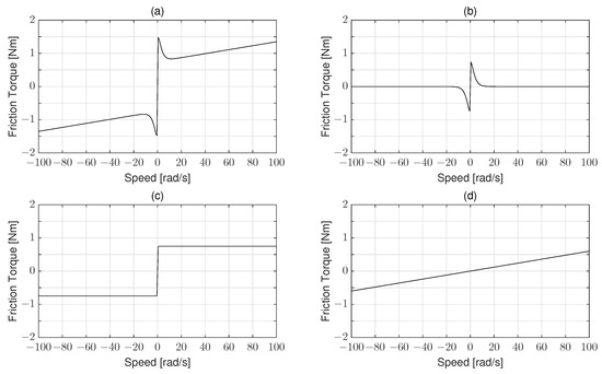 Example of nonlinear friction: (a) static + coulomb + viscous friction, (b) static friction, (c) coulomb friction, (d) viscous friction.
