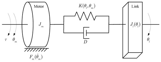 where and are the angular positions of the link-side and motor-side, respectively. and , which depend on the position of the link, are the link inertia and the gravity term, respectively. While the coriolis and centrifugal term depend on the position and velocity of the link, the motor inertia and the damping D have a constant value. is the torque input to the motor. As shown in Figure 1, the nonlinear friction on the motor side is given by: