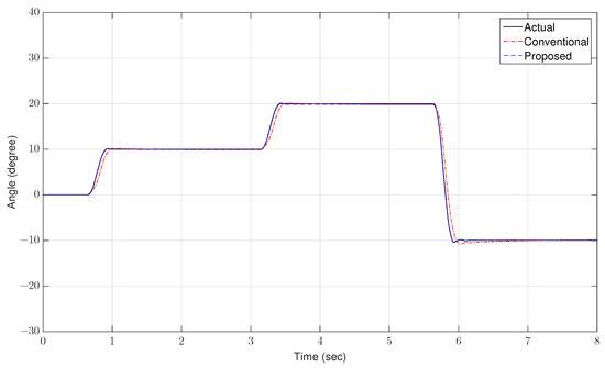 Now, as shown in Figure 5, we perform an experiment to compare the proposed observer considering the nonlinear stiffness and friction with the conventional observer considering only the nonlinear stiffness of [9]. The actual link trajectory (black solid line) controlled by the pre-installed PID controller is the measured value from the optical incremental encoder on the load motor. From the conventional and proposed observer, the estimated values of the actual link trajectory are indicated by the dash–dot (red color) line and dashed (blue color) line, respectively. For a more detailed performance comparison, we enlarge Figure 5 at 1.2 s and 6.2 s, as depicted in Figure 6. In order to evaluate the estimation performance, we calculate the RMSE (Root Mean Square Error) of the link position estimation error for the conventional method and proposed approach, respectively, as follows.