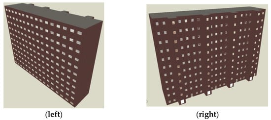 The following figures include a 3D view (Figure 1) and floor plans (Figure 2) of the building type considered. The floor plan of the building corresponds to a simple layout with landings every two floors and carpentry oriented to the north and south for all the dwellings.