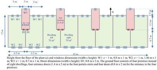 The building type was located in Spain, a country characterized by its mild climate and water scarcity. The choice of the typical residential building in Spain has been based on data collected from the Population and Housing Census [25]. It corresponds to the average surface of new real estate developments in the expansion areas of medium and large cities. Their main geometric characteristics are detailed in Table 1.