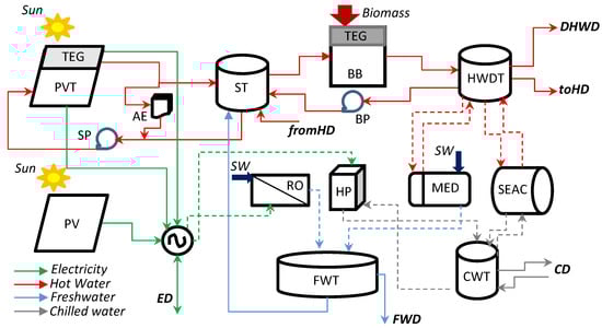 Thus, the four combinations analyzed for the polygeneration system differ in selecting technology for cooling and desalination (whose flows are marked as dashed lines in Figure 3 depending on the chosen technology), as shown in the attached Table 4. In any case, the final design of each option will be different in terms of the number of PV/PVTs, biomass boiler power, HP/SEAC capacity, and size of the hot and cold water storage tanks. Moreover, the setpoints of the boiler and start-up of the thermally activated technologies (MED, SEAC) may differ slightly depending on the overall integration scheme.