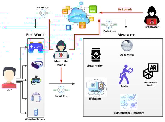 An innovative use of the Metaverse is the incorporation of a virtual world in an educational setting, which investigates its viability as an additional digital tool to the teaching–learning process in the context of a university, where the flexibility of access to synchronous and asynchronous information presents an alternative method of knowledge transmission and acquisition through technological means. In [53], social virtual reality-based learning environments (VRLEs) were studied. A risk assessment method was proposed by the authors in this paper. In particular, to study young people with autism spectrum disorder (ASD), they used social VRLEs such as vSocial. It is important for VRLEs to provide a safe environment for young people with learning disabilities. VRLEs use emotion-tracking sensors, and their data are stored in a cloud environment. Attacks on these data can lead to negative effects, such as changing content and learning results (Figure 3). VRLEs were assessed in this paper for the first time in terms of security and privacy concerns. All three aspects of security, privacy, and safety were considered. Three attack scenarios were presented in this study, each involving different aspects of security, including loss of nodes, packet sniffing, and malicious network changes. Tree structures depict attack scenarios using root nodes and leaf nodes as targets and attacker activities, which illustrate the relationship between possible system vulnerabilities and attack scenarios. Based on the likelihood of the threat occurring, the authors used this concept to analyze server threats to vSocial and risk scores. To create the tree, they use the SecurITree tool with countermeasure nodes, rate, and weights as inputs. Besides frequency rates (i.e., the number of times an attack occurs over a period of time), they also used the duration of attacks to calculate risk. Additionally, network discrepancy, packet loss, and sniffing attacks were used to attack the system, and they evaluated how these attacks impact storage, network, and VR rendering. As a result of this tree, they determined the probability of occurrence, which is a well-known measure of risk. SPS creates a risk score based on the probability of occurrence and impact of the threat. Generally speaking, the higher the risk score associated with a threat, the greater the risk. Based on the results, creating a defensive strategy for the system is made easier. Users connect to the virtual classroom using head-mounted display (HMD) devices, such as HTC Vive (HTC, New Taipei City, Taiwan) or Oculus Rift (Meta Platforms, Menlo Parks, CA, USA), through a cloud-based application hosted on the global environment for network innovations (GENI). They used Steam (an online game platform for simulation), Netlimiter (an internet traffic control tool to simulate DoS attacks), Wireshark (an open-source network protocol analyzer), and Clumsy 0.2 (a Windows-based tool for controlling network conditions). Their results indicated that any upload speed below 30 Kbps resulted in high-fidelity crashing, but the frame rate was not significantly affected. In terms of privacy, they simulated packet sniffing attacks and demonstrated that avatar information, confidential host information, and server details were completely exposed, implying that all user information could be captured and deciphered. From a safety standpoint, they demonstrated that reducing the bandwidth can result in abrupt changes in VR content. In terms of attack tree results, an ad hoc attack tree alternately under-represents system vulnerabilities, resulting in a lower risk score, where a lower risk score indicates low susceptibility to threats, necessitating stronger countermeasures. As a result, the quality of an ad hoc attack tree fails.