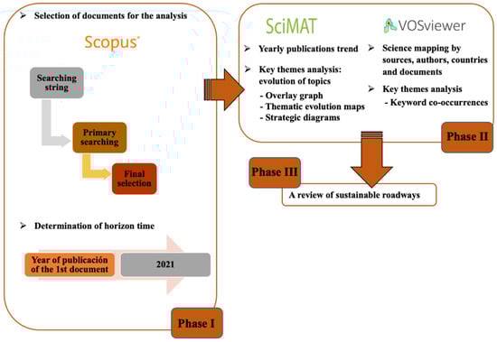 This paper collects and synthesises the available research on sustainable road transport infrastructure to produce a quantitative evaluation and literature review. To develop this study, the applied methodology includes three different phases and sub-phases summarised in Figure 1 and described below.