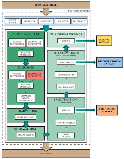 The carotenoid and phycobiliprotein production process was divided into seven sub-systems with the aim of maximising biomass utilisation and to reduce product wastage. The evaluated system and its boundaries are depicted in Figure 1.