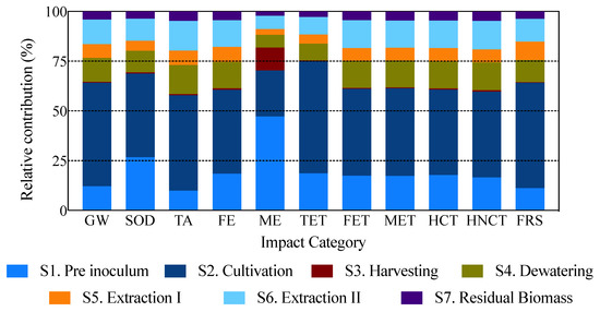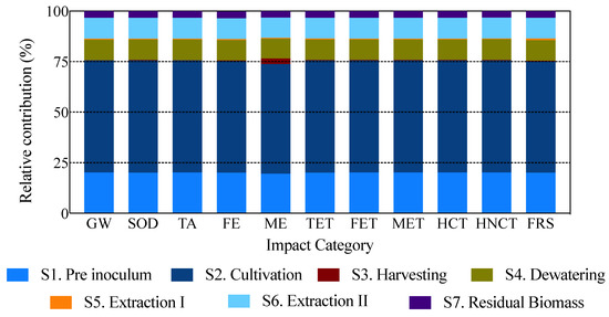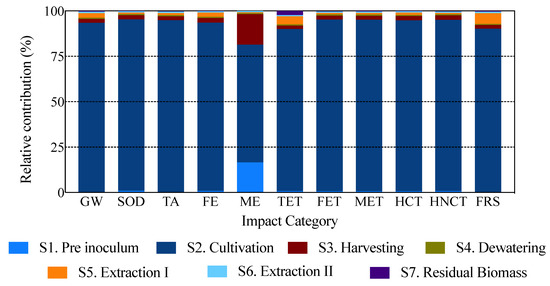 The relative contribution (Figure 6) was again mostly impacted by the pre-inoculum and cultivation subsystems, with a higher proportion to S2 (95%), for the other subsystems; the average contribution was S1 (0.2–1%), S3 (1%), S4 (0.5%), S5 (0.5–4%), S6 (0.5%) and S7 (0.2%), except for ME, where the cultivation subsystem decreased to 65% and harvesting increased to 16.5% due to the wasted culture medium. Contrarily to the demonstration-scale, the detailed analysis of the subsystems S2 showed that energy was responsible for about 98% of the impact, except for marine eutrophication (ME) in S1, which is highly impacted by the wastewater discharged during the cleaning process, and in S2, which was impacted using sodium nitrate.