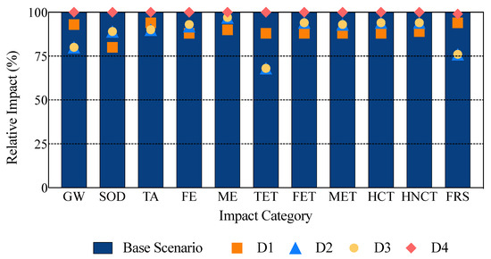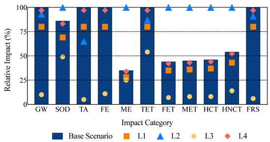 By reducing the electricity consumption by 20% (scenario L1), the environmental load of the process was also reduced by 20%, which corroborates the critical point found in the baseline scenario, where electricity corresponds to most of the total impact. Moreover, the substitution of the Portuguese electricity mix with that of Europe (Scenario L2) leads to a reduction in the categories GW, TA, TET and FRS, while in the others some increases could be seen, highlighting that the impact of FE, ME, FET, MET and HCT increased by more than 100%, probably due to the lower share of renewable energy in Europe (22.1%) compared to Portugal (33.9%) [46]. In the third scenario (L3, Swedish energy emissions use), all factors decreased, on average by 74%. Sweden is considered the European country with the highest rate of renewable electricity (60.1%), mainly due to the use of hydropower (39.3%) [47], while in Portugal, although hydropower and wind account for a large share of energy consumption, coal and natural gas can increase the overall impact of this electricity mix [39].