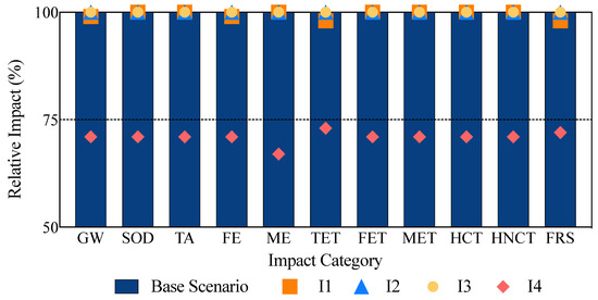 Considering the previous discussion, a sensitivity analysis was carried out based on four different scenarios for the industrial-scale process, taking into consideration the identified hotspots of the downstream process life cycle: (I1) reducing the biomass productivity by 50% [49]; (I2) the use of spray-drying of biomass [38]; (I3) the use of tray-drying of biomass [51]; (I4) and the use of a semi-continuous process (reduction of S1 impact) [52]. The results of the sensitivity analysis are shown in Figure 7.