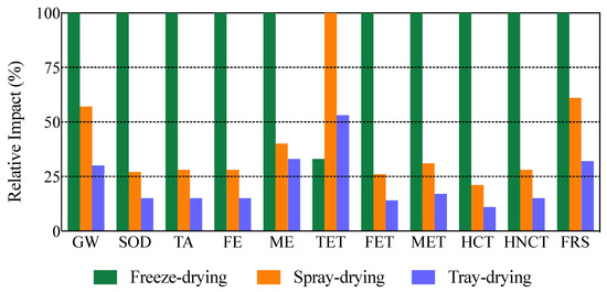 The evaluation of the environmental impact from the industrial-scale reactor (100 m3) was characterized in terms of the total impact of the batch, and one litre of culture, with the respective mass and economic allocation for each extract (Table 6). The relative contribution of each subsystem of the system is depicted in Figure 6.