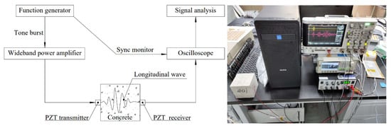 Using the device illustrated in Figure 2, measurements of ultrasonic longitudinal parameters were taken. A sine pulse signal with 5 cycles and a frequency of 75 kHz was generated by the signal generator (SDG 5162) at a repetition rate of 3 ms and a peak-to-peak voltage of 8 Vp-p. Then, the voltage of the signal was increased to 56 V using a wideband power amplifier (KROHN-HITE 7602M) and transmitted to the PZT transducer. At the other end of the specimen, another PZT received the signal. In addition, a channel was set up to monitor the output of the sync signal. An oscilloscope (Agilent InfiniiVision DSOX 3014A) acquired the received time-domain signal averaging 256 times with a sample length of 16,000 at a sample rate of 625 MSa/s.
